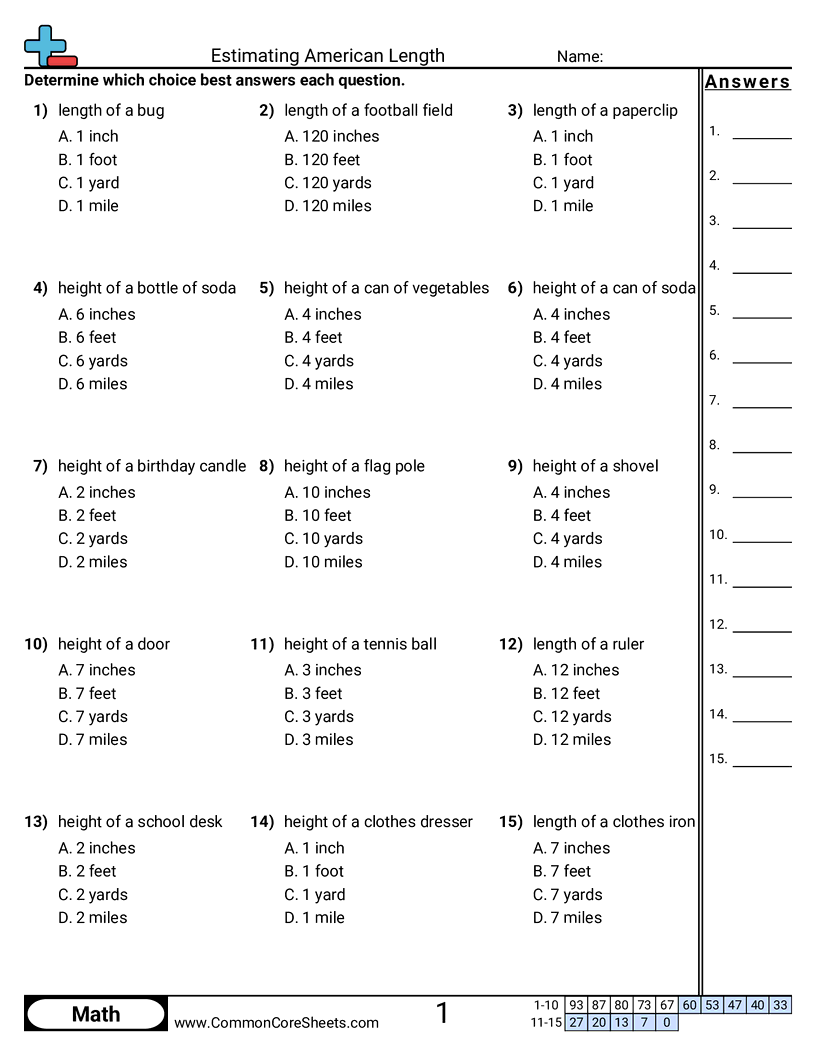 Free 4th Grade (4md1) math worksheets on Estimating American Length . Each worksheet has 15 problems with an answer key and are ideal for teachers and homeschooling. You can download the PDF, create a set of flash cards or set it up for online learning.