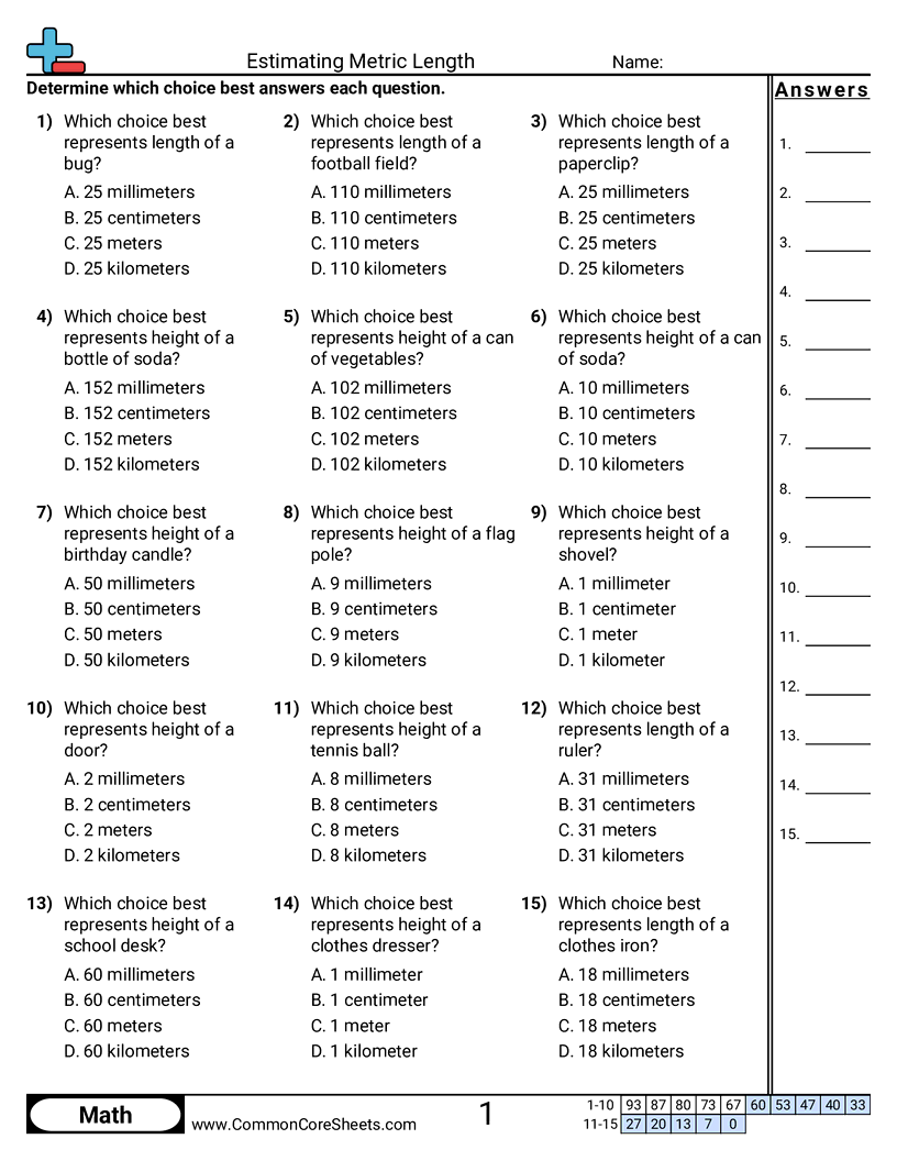 Free 4th Grade (4md1) math worksheets on Estimating Metric Length . Each worksheet has 15 problems with an answer key and are ideal for teachers and homeschooling. You can download the PDF, create a set of flash cards or set it up for online learning.