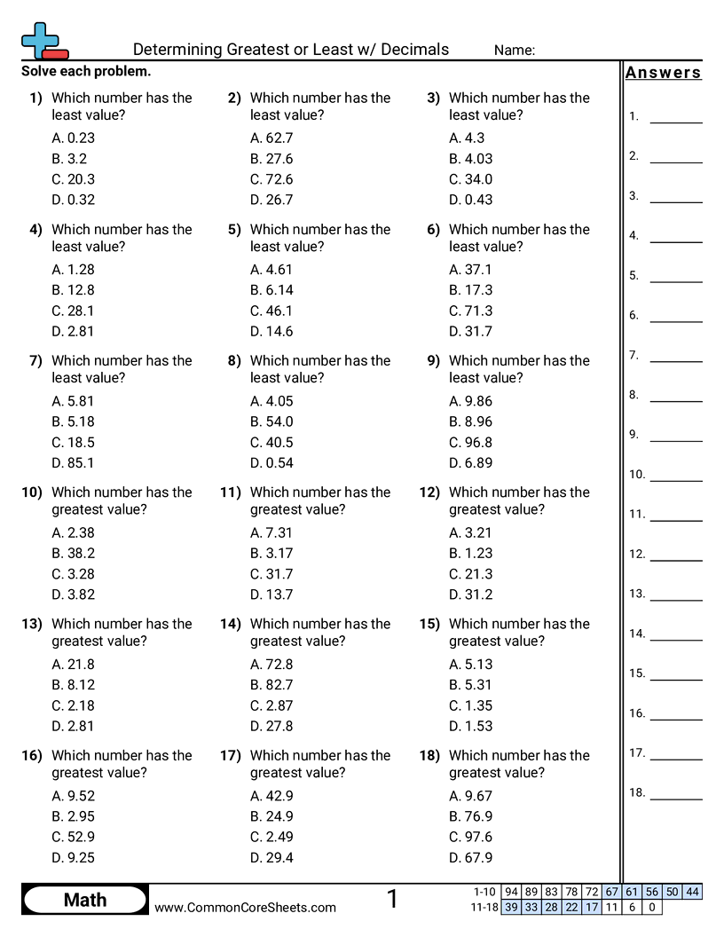 Free 4th Grade (4nf7) math worksheets on Determining Greatest or Least w/ Decimals. Each worksheet has 18 problems with an answer key and are ideal for teachers and homeschooling. You can download the PDF, create a set of flash cards or set it up for online learning.
