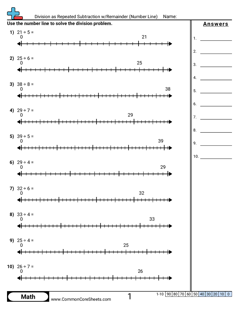 Each worksheet has 10 problems using a number line to solve division problems with a remainder using repeated subtraction.