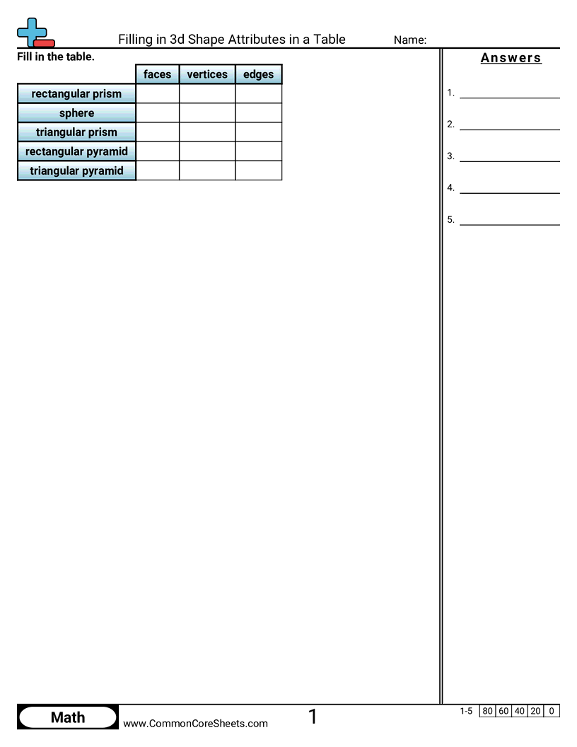 Free math worksheets on Filling in 3d Shape Attributes in a Table. Each worksheet has 5 problems with an answer key and are ideal for teachers and homeschooling. You can download the PDF, create a set of flash cards or set it up for online learning.