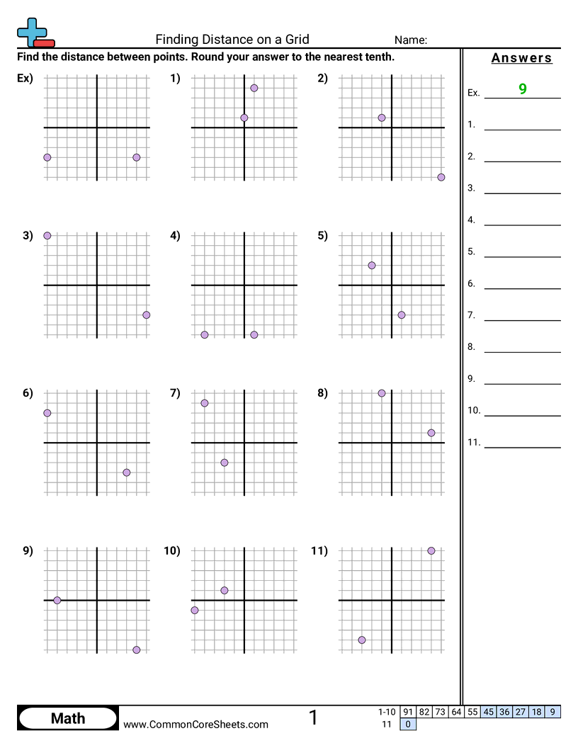 Free math worksheets on Finding Distance on a Grid . Each worksheet has 11 problems with an answer key and are ideal for teachers and homeschooling. You can download the PDF, create a set of flash cards or set it up for online learning.