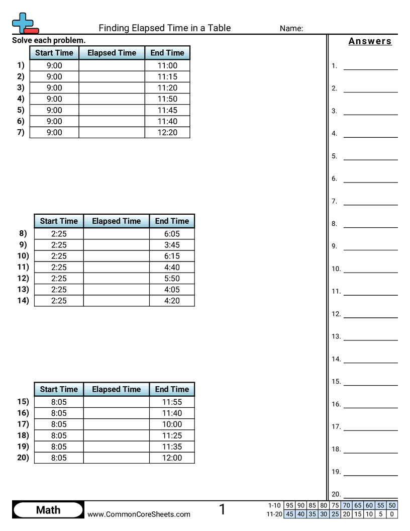 Free math worksheets on Finding Elapsed Time in a Table. Each worksheet has 20 problems with an answer key and are ideal for teachers and homeschooling. You can download the PDF, create a set of flash cards or set it up for online learning.