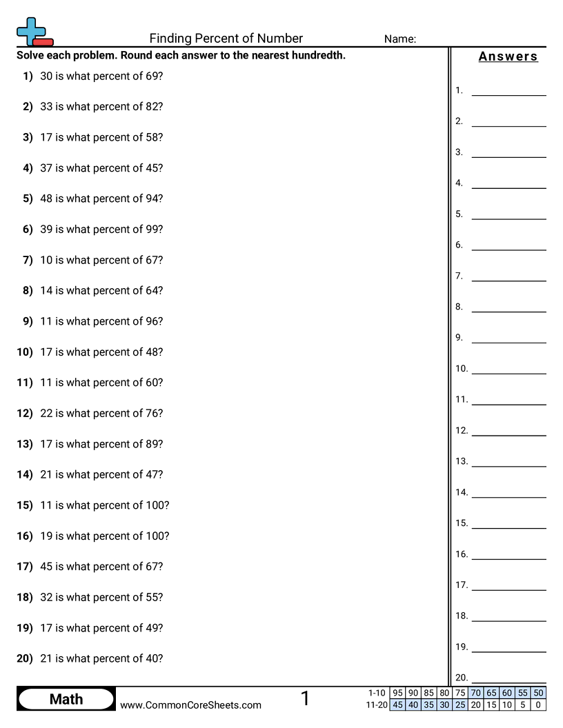 Each worksheet has 20 problems finding the percent of a number.
