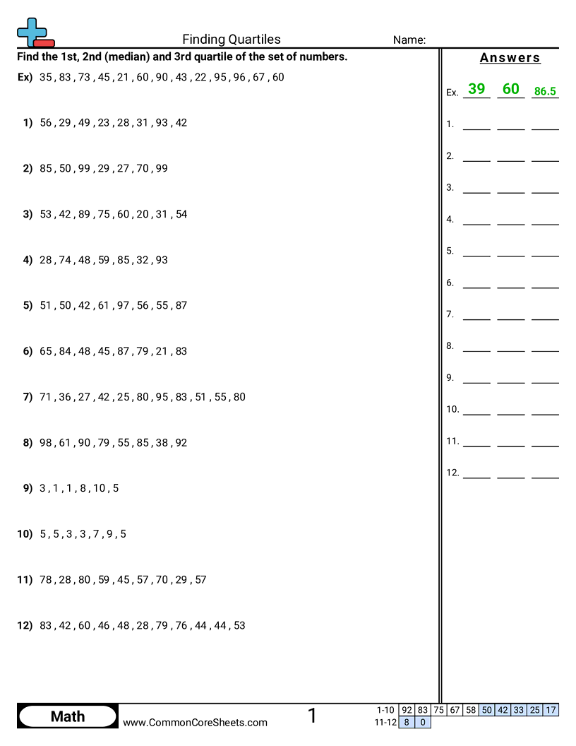 Each worksheet has 12 problems splitting a set of numbers into quartiles.