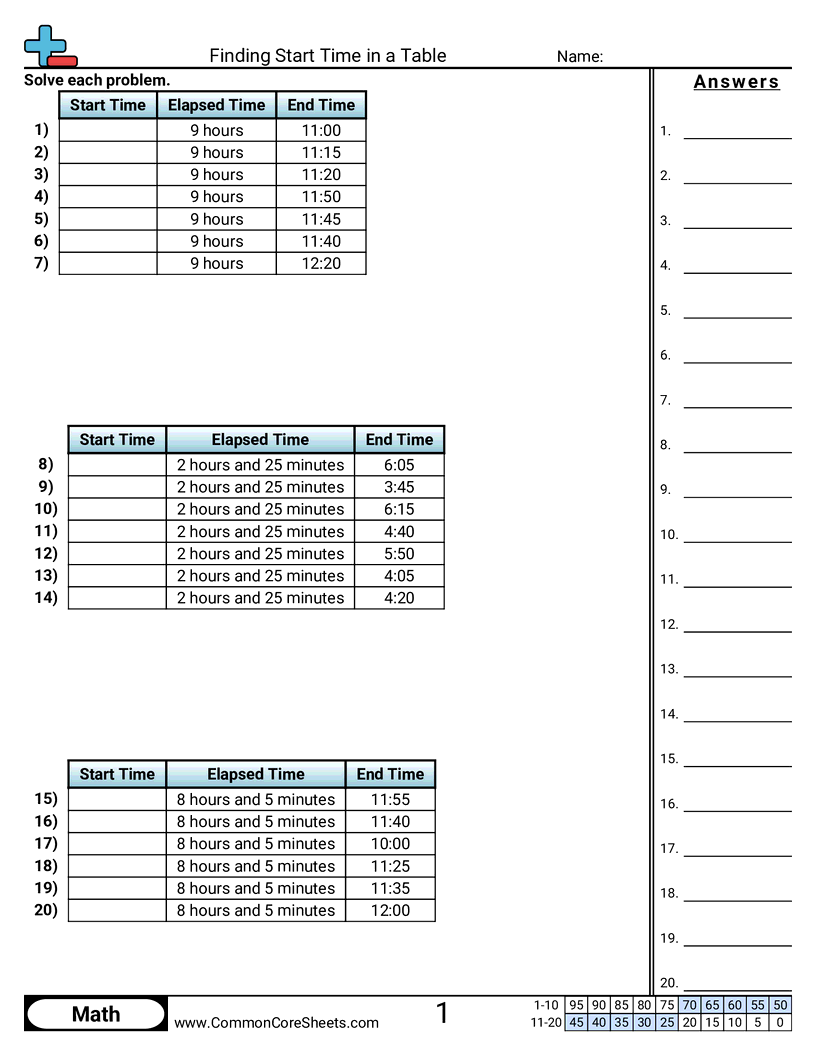 Each worksheet has 20 problems finding the start times in a table given the same elapsed time.