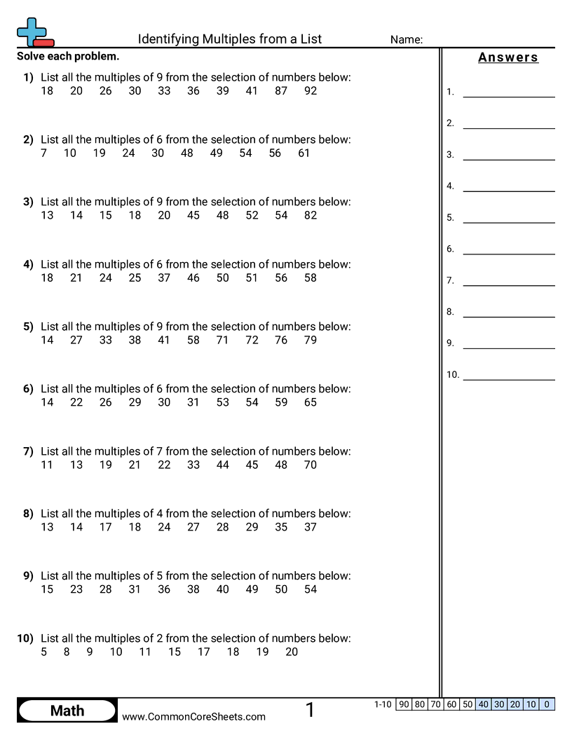 Each worksheet has 10 problems identifying multiples from a list of numbers.