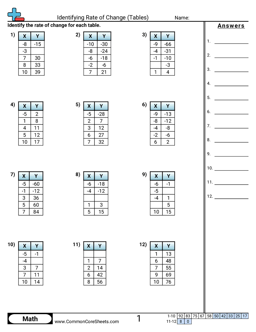 Each worksheet has 12 problems identifying the rate of change using information in a table.