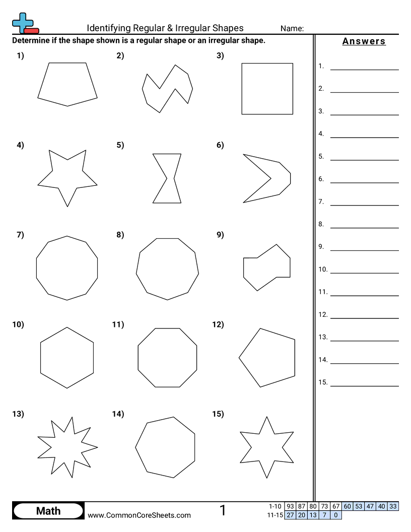 Each worksheet has 15 problems determining if a shape is a regular or irregular shape.