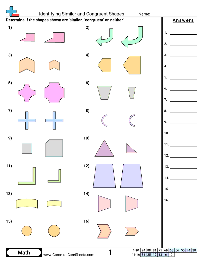 Free math worksheets on Identifying Similar and Congruent Shapes. Each worksheet has 16 problems with an answer key and are ideal for teachers and homeschooling. You can download the PDF, create a set of flash cards or set it up for online learning.