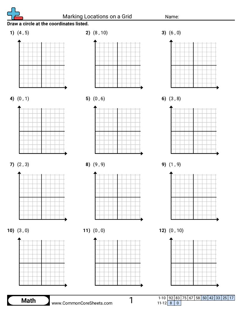 Free 5th Grade (5g1) math worksheets on Marking Locations on a Grid. Each worksheet has 12 problems with an answer key and are ideal for teachers and homeschooling. You can download the PDF, create a set of flash cards or set it up for online learning.