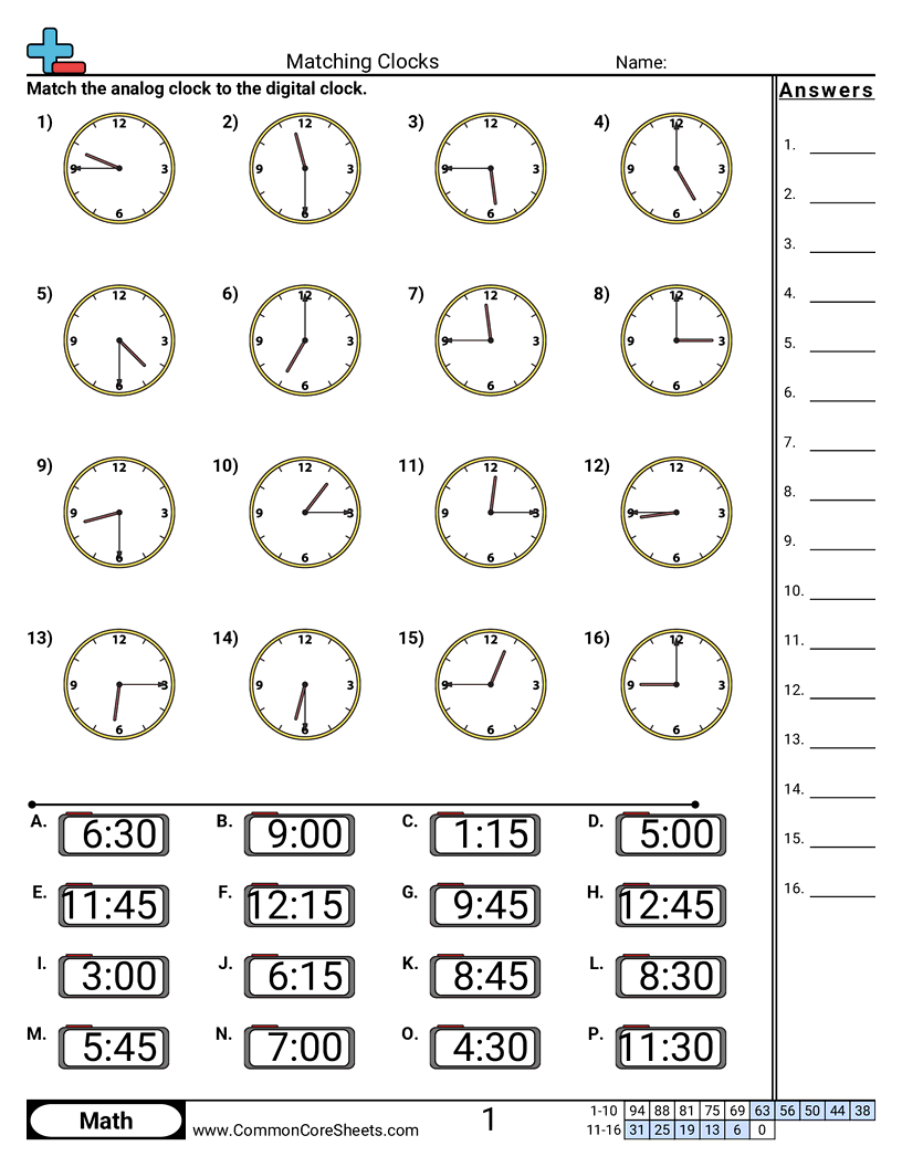Each worksheet has 16 problems matching an analog clock to its digital equivalent.