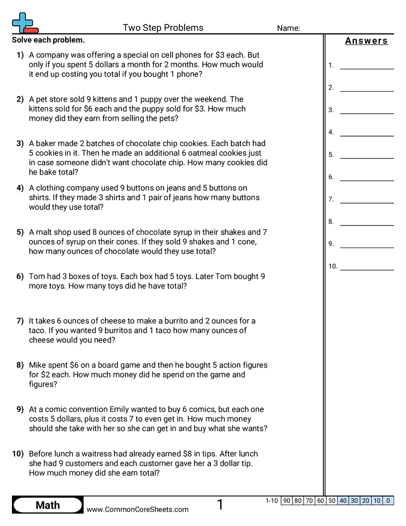 Free 3rd Grade (3oa8) math worksheets on Two Step Problems. Each worksheet has 10 problems with an answer key and are ideal for teachers and homeschooling. You can download the PDF, create a set of flash cards or set it up for online learning.