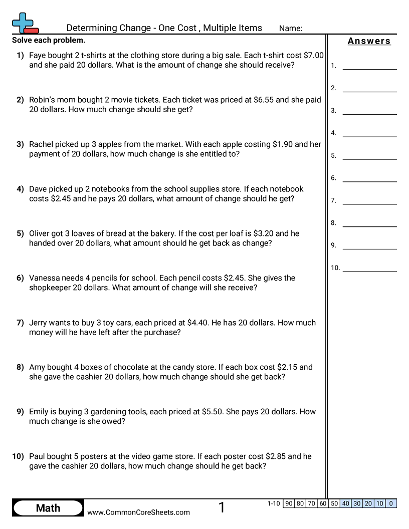 Determining Change - One Cost , Multiple Items Worksheet Download