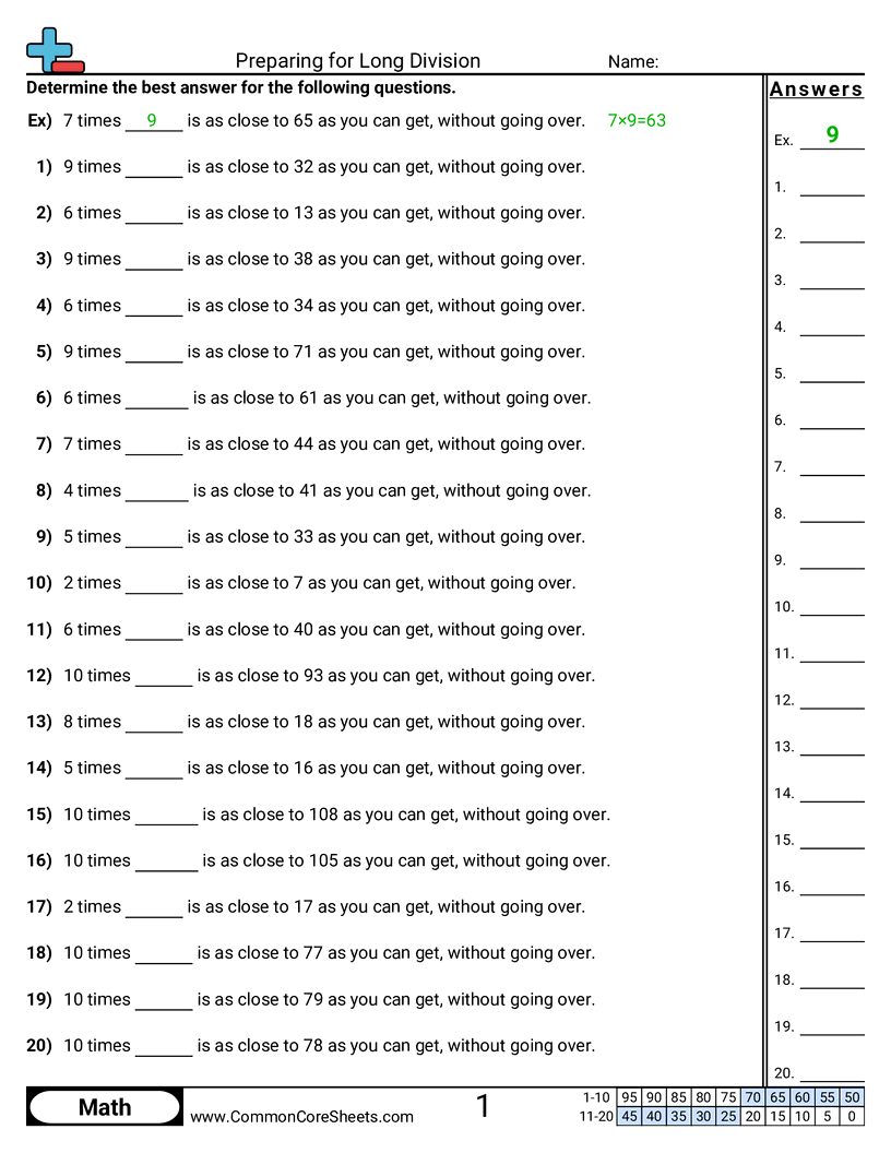 Preparing for Long Division Worksheet Download
