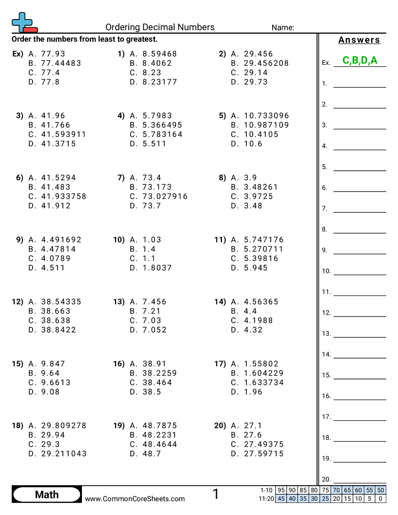 Each worksheet has 20 problems ordering numbers with decimals up to the hundredths place.